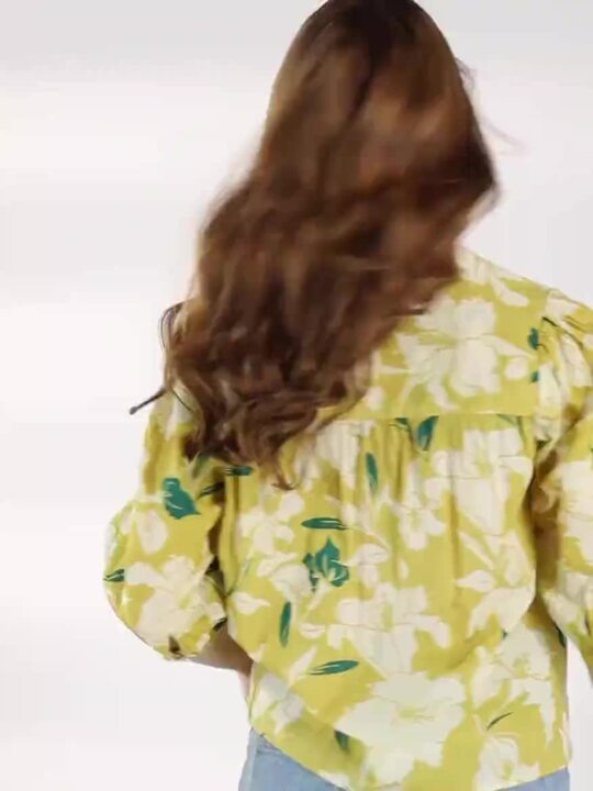 Yellow & Off White Floral Print Mandarin Collar Puff Sleeve Cotton Top